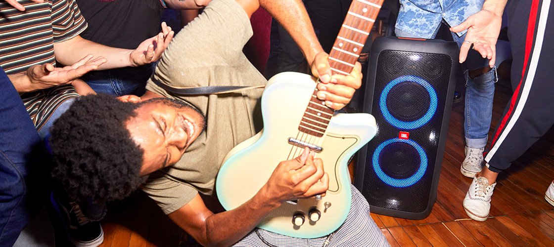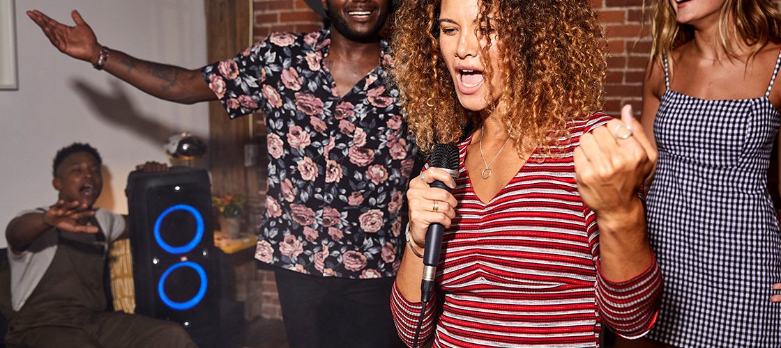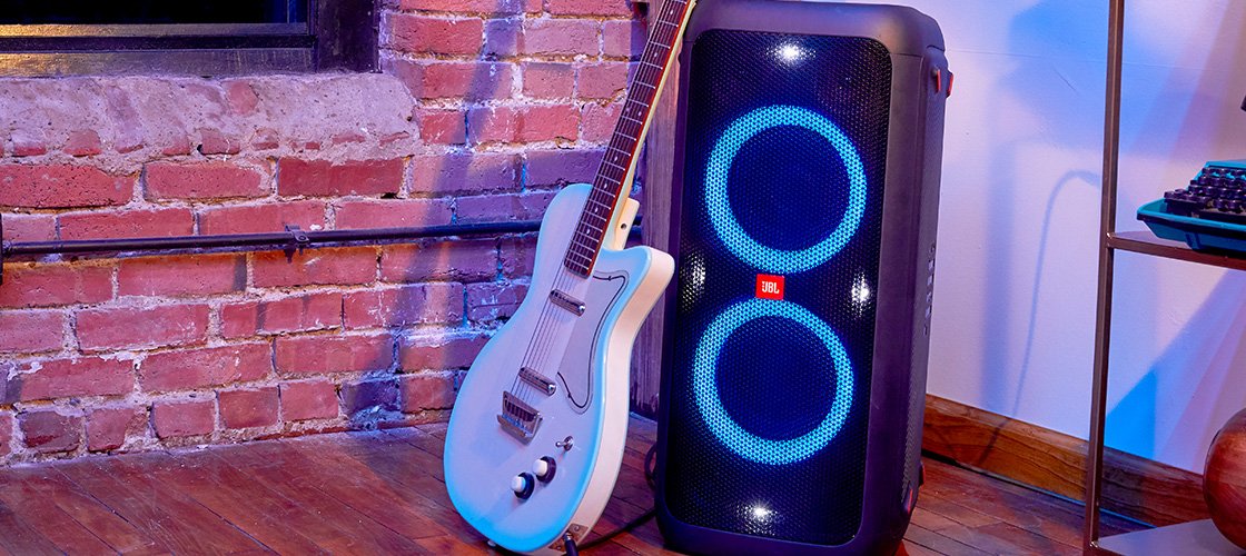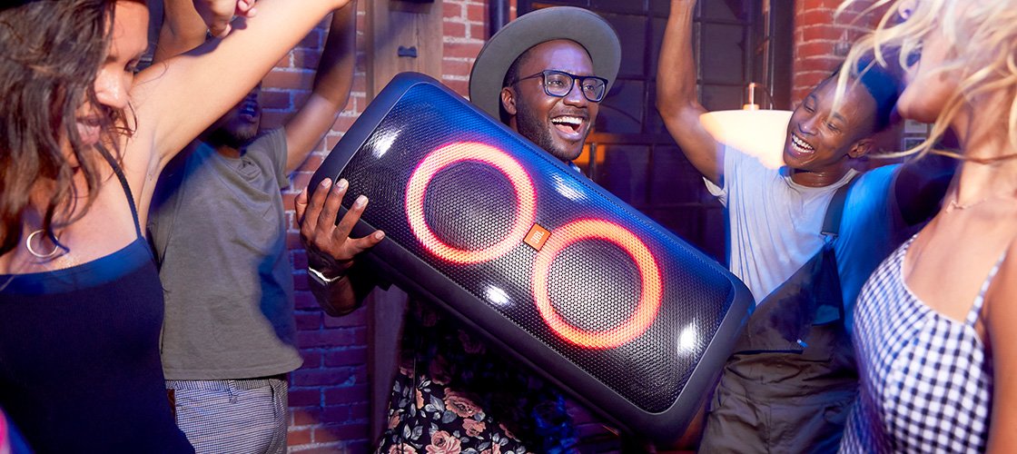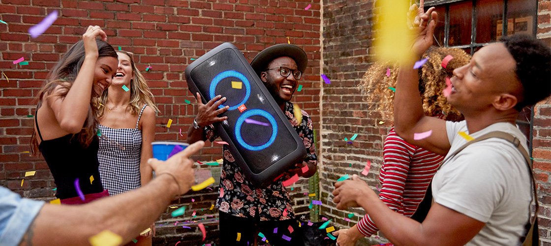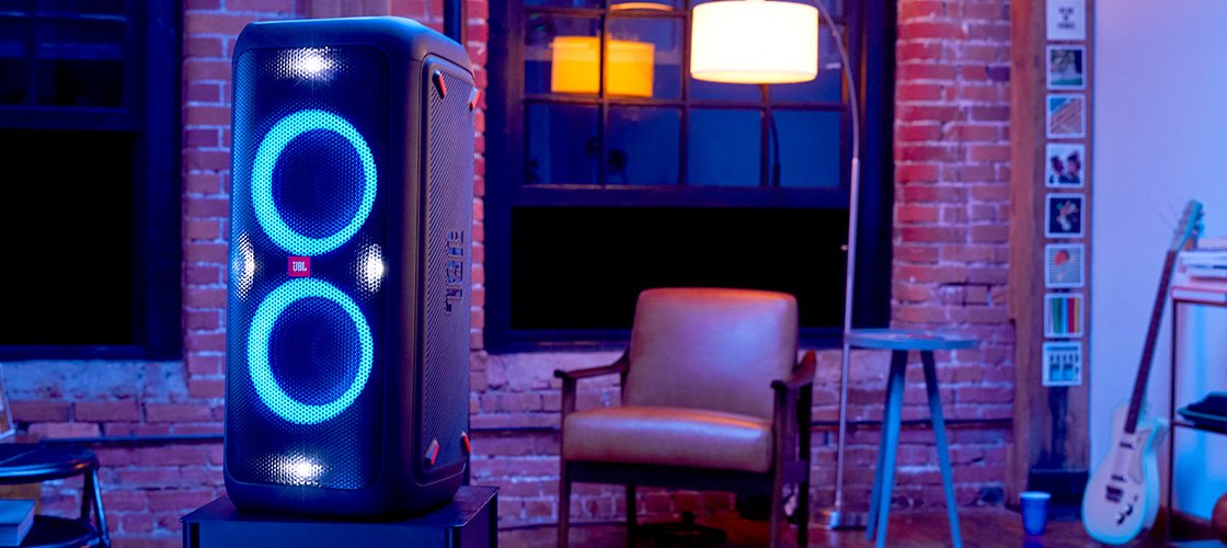 Desfrute de uma experiência de áudio imersiva em casa ou numa festa que somente o som da JBL pode oferecer.