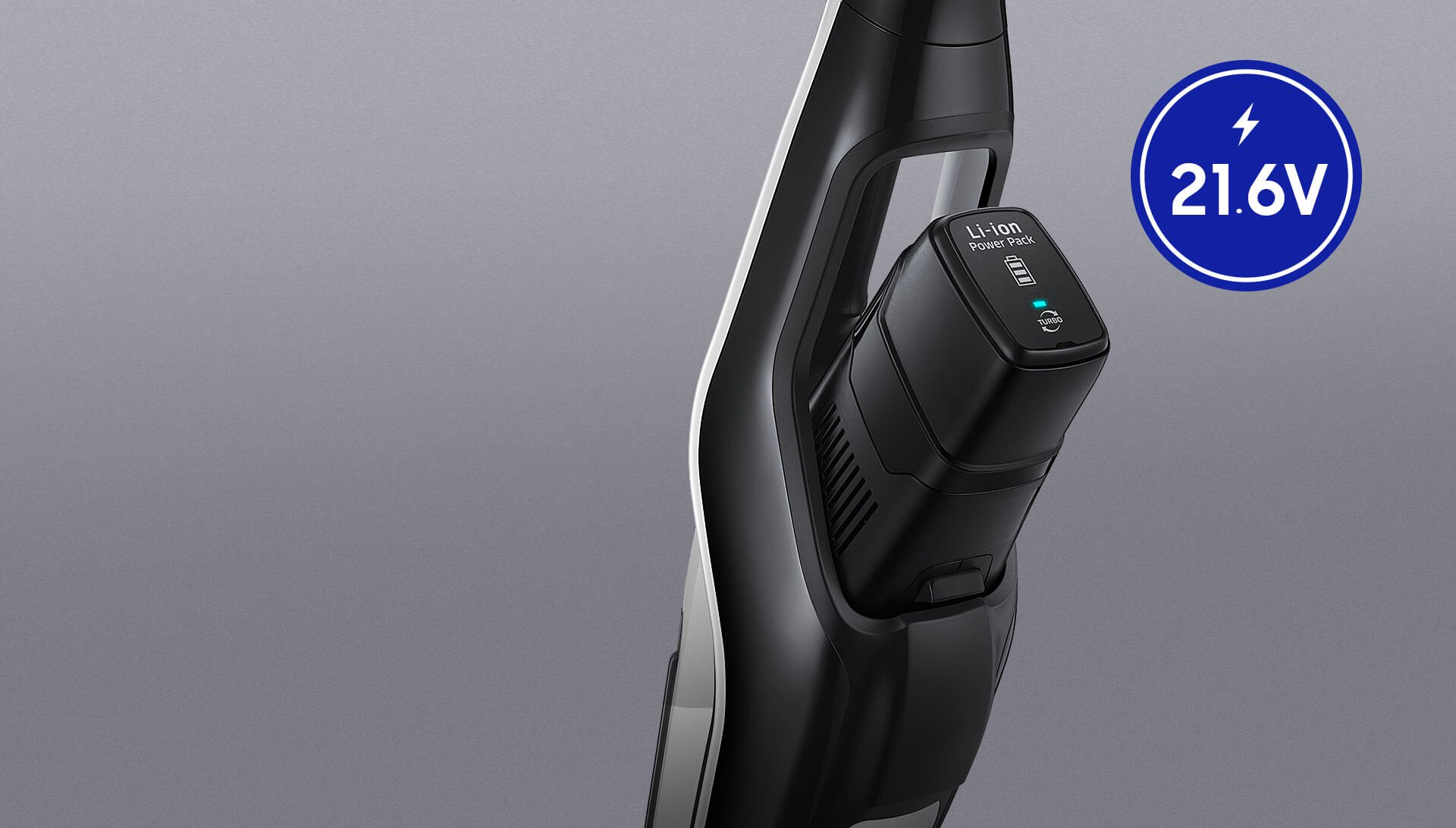 A poderosa bateria removível de 21,6V de íon de lítio é duradoura, garantindo até 30 min de uso contínuo e leve, facilitando o uso. Ela pode ser substituída com apenas um toque, para você não precisar interromper a limpeza.