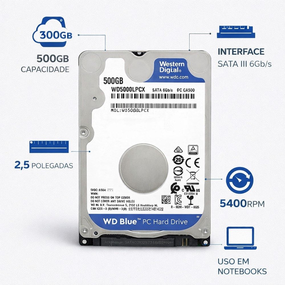 Quando o notebook começa a ficar lento para salvar arquivos, atualizar programas ou até baixar fotos e vídeos, o problema muitas vezes é falta de espaço. O HD Interno Western Digital WD Blue 500GB é uma escolha confiável para quem quer dar fôlego ao armazenamento com um componente de marca reconhecida e formato ideal para notebooks.