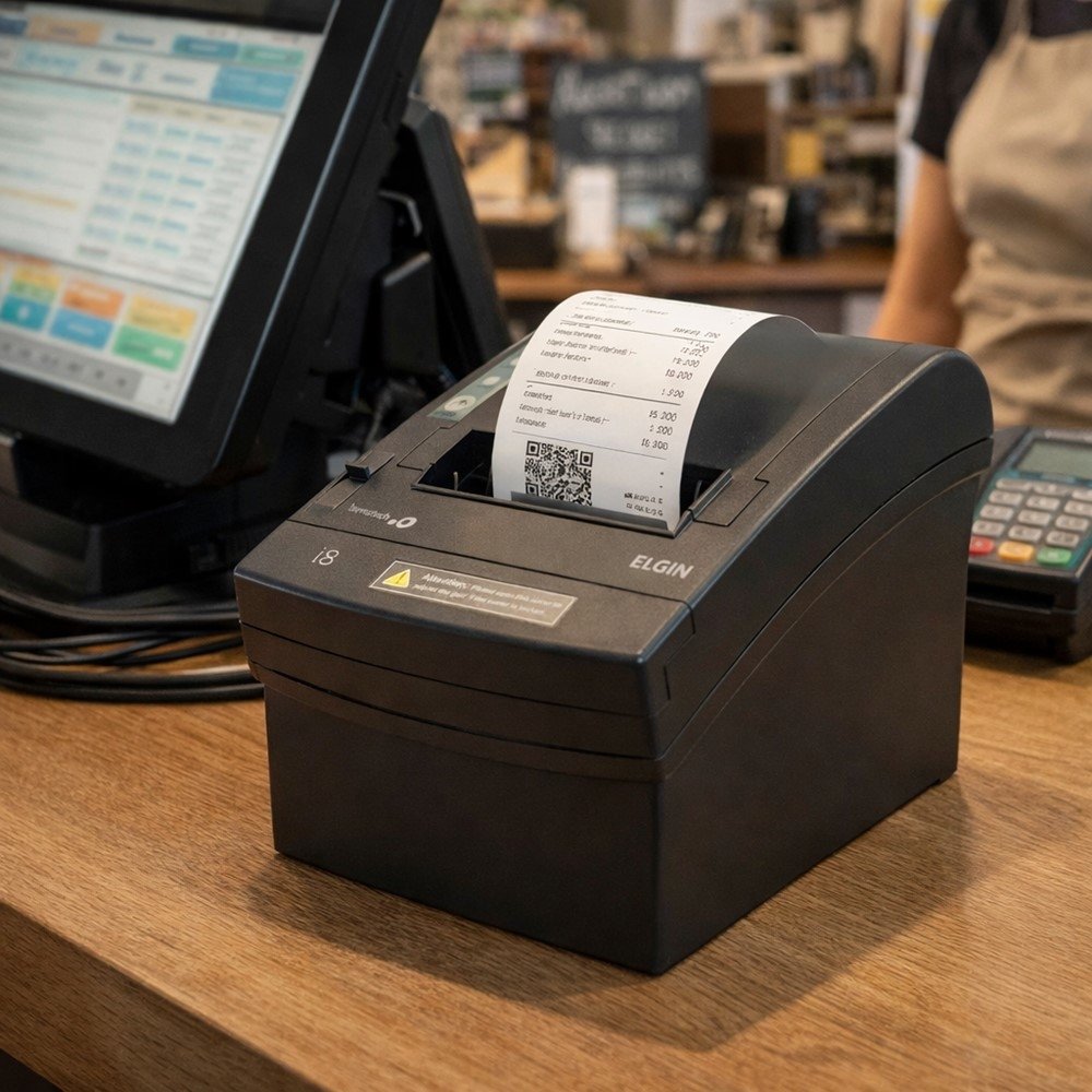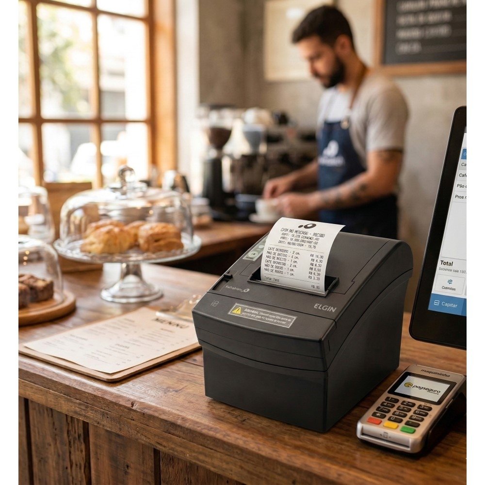 Por ser térmica (não fiscal), a impressão ocorre sem uso de cartuchos de tinta, o que simplifica a operação e torna o processo mais direto para o time: colocou o papel, imprimiu, entregou.