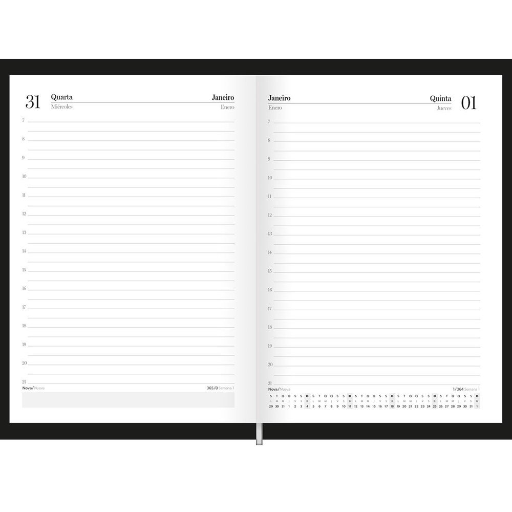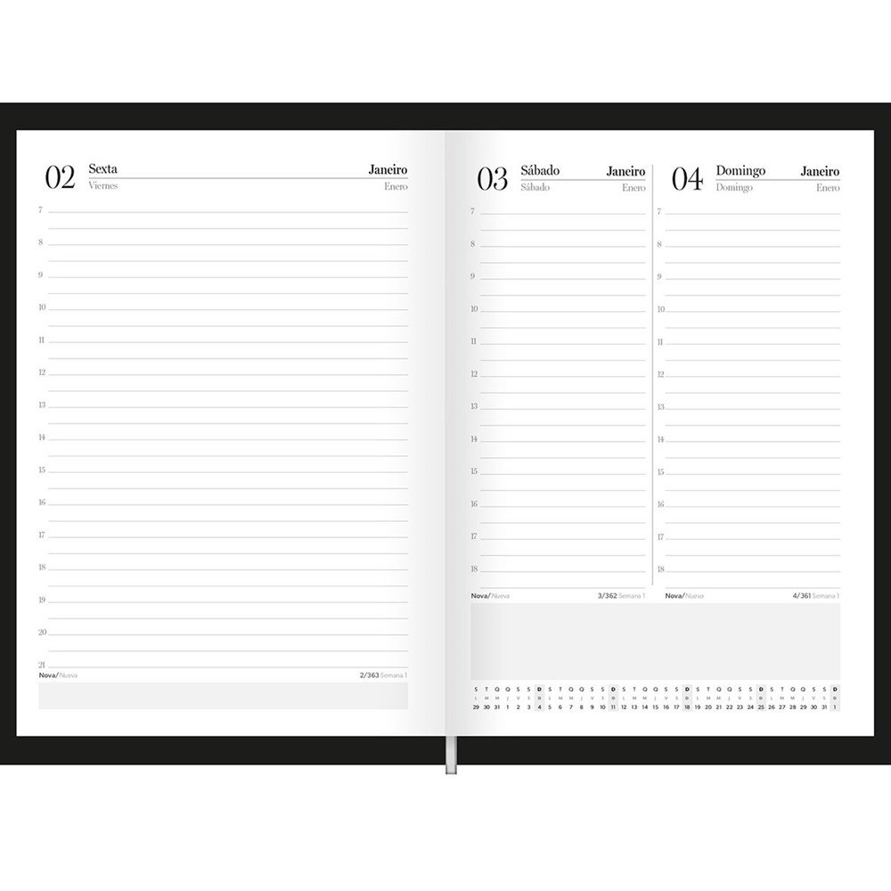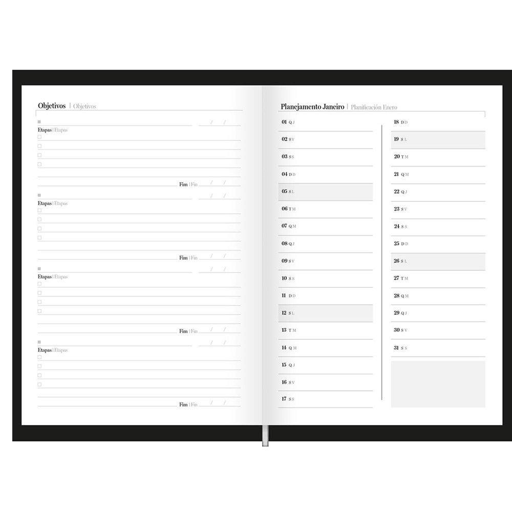 | Dados Adicionais | - Gramatura: 56 g/m² - Miolo em 2 idiomas: Português e Espanhol - Visão 1 dia por página, exceto sábado e domingo - Acessórios: fitilho marcador de página |