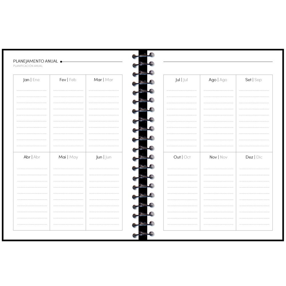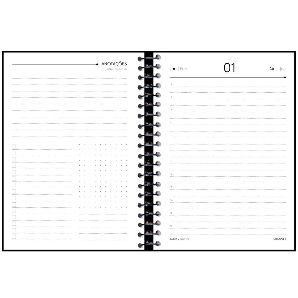 | Dados Adicionais | - Laminação Brilho - Espiral Preto - Miolo datado com visão diária, um dia por página, exceto sábado e domingo. |