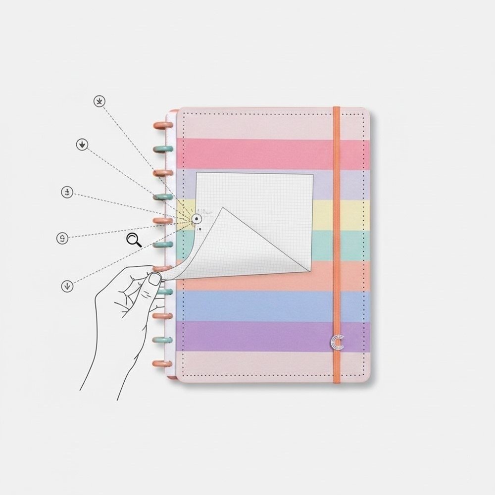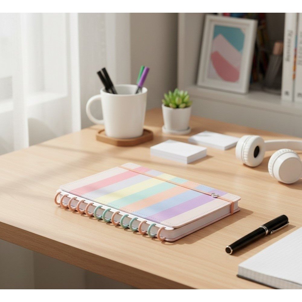 O Caderno Inteligente Arco-Íris Pastel Grande é para quem quer unir organização e praticidade na rotina de estudos, trabalho ou planejamento. A proposta é simples: um caderno que acompanha suas mudanças de ideia - com um visual delicado e atual, perfeito para quem gosta de papelaria com personalidade.
