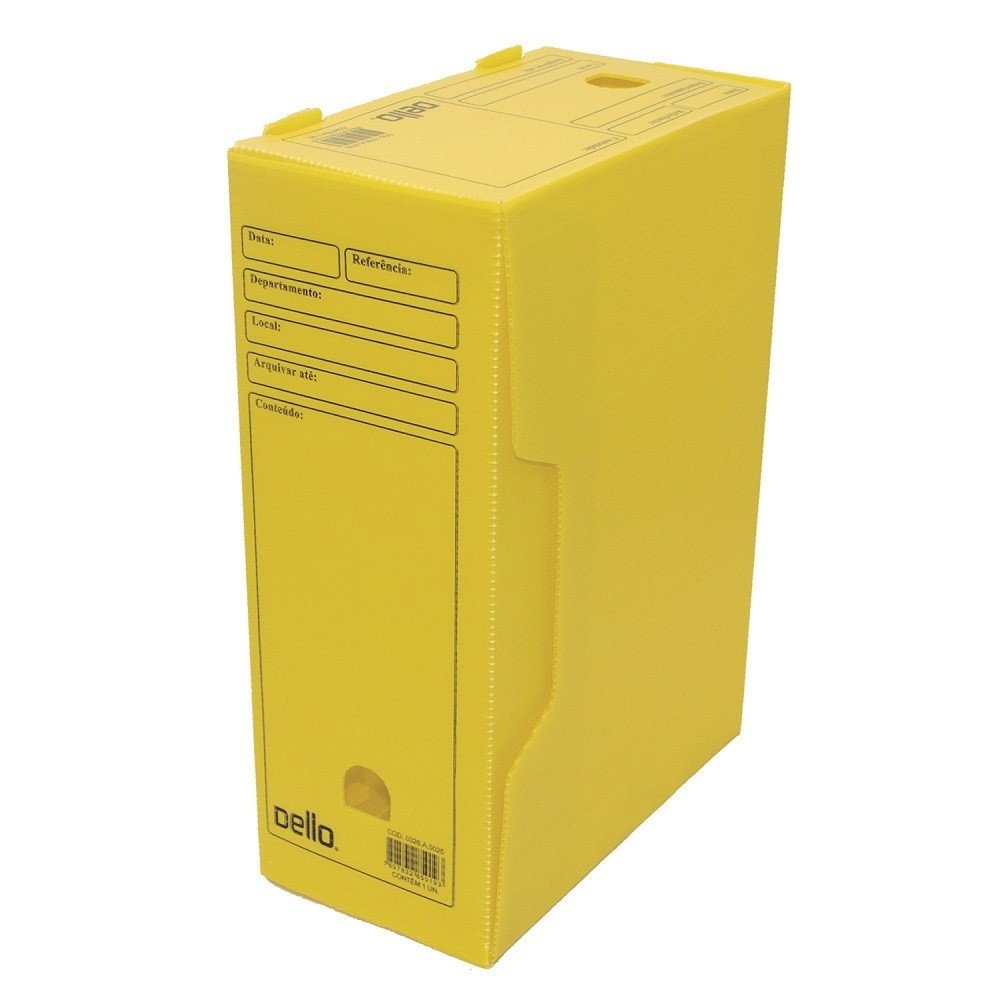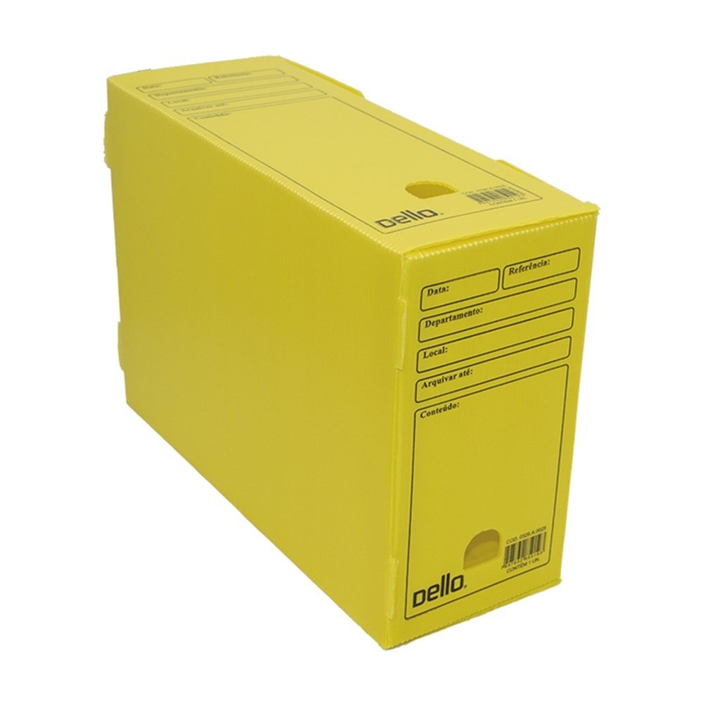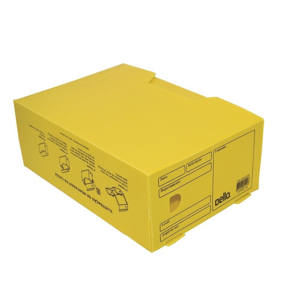 Caixa em plástico corrugado no tamanho ofício. Possui 3 áreas em diferentes posições de identificação.