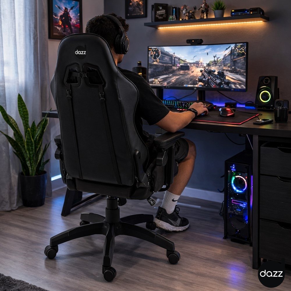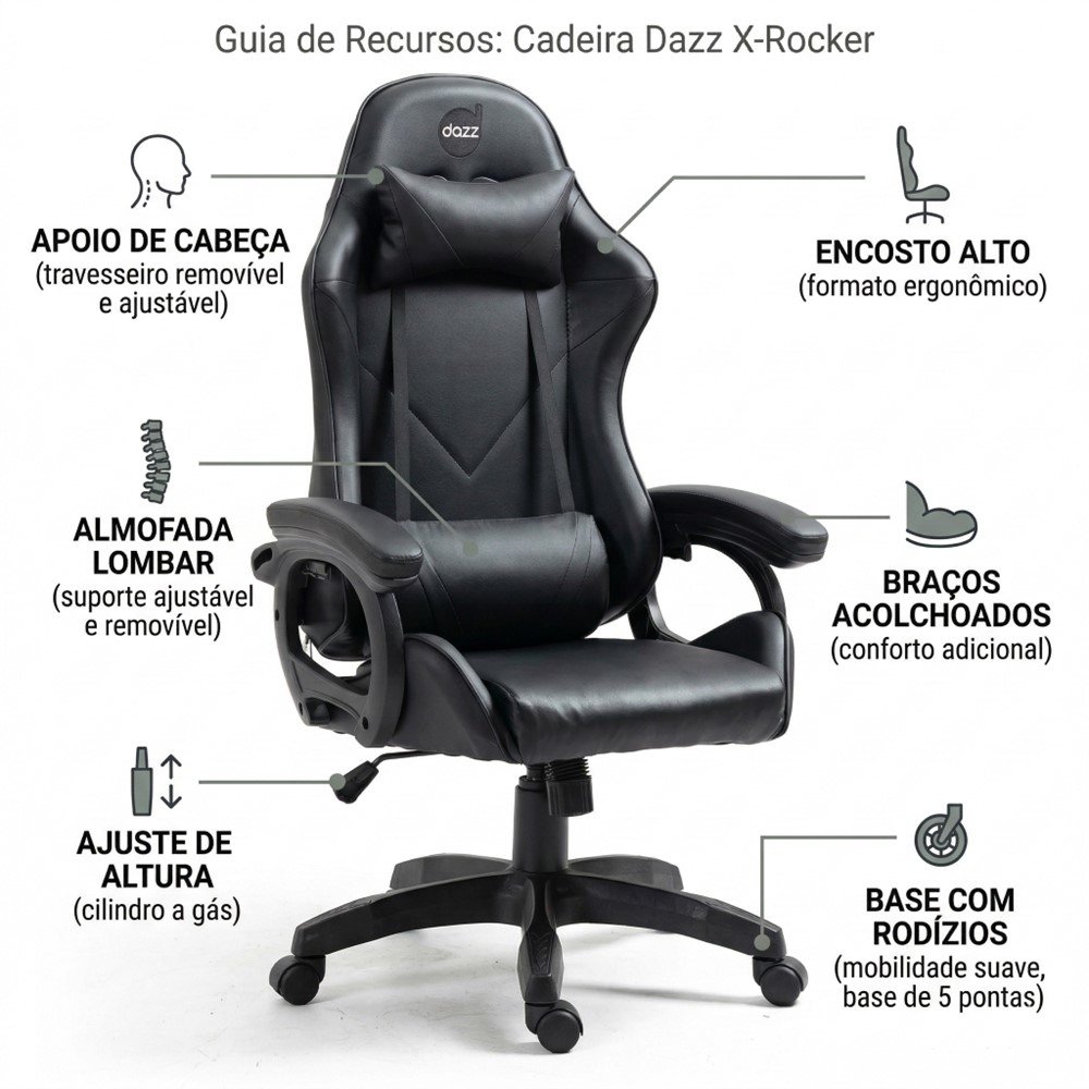 A Cadeira Gamer Dazz X-Rocker Preta foi pensada para quem passa bastante tempo no PC e quer uma experiência mais confortável e organizada no setup. Em vez de "aguentar" a cadeira ao longo do dia, você ganha uma base mais adequada para manter a postura e reduzir o cansaço em sessões longas - seja em jogos, estudo ou home office.
