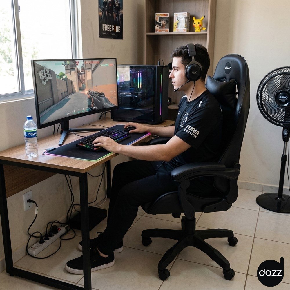 O visual gamer em preto combina facilmente com diferentes ambientes e periféricos, deixando o espaço mais alinhado sem chamar atenção demais. E o melhor: quando a cadeira se encaixa na sua rotina, você percebe no uso real - mais foco, mais conforto e uma sensação de setup "pronto" para acompanhar o seu ritmo.
