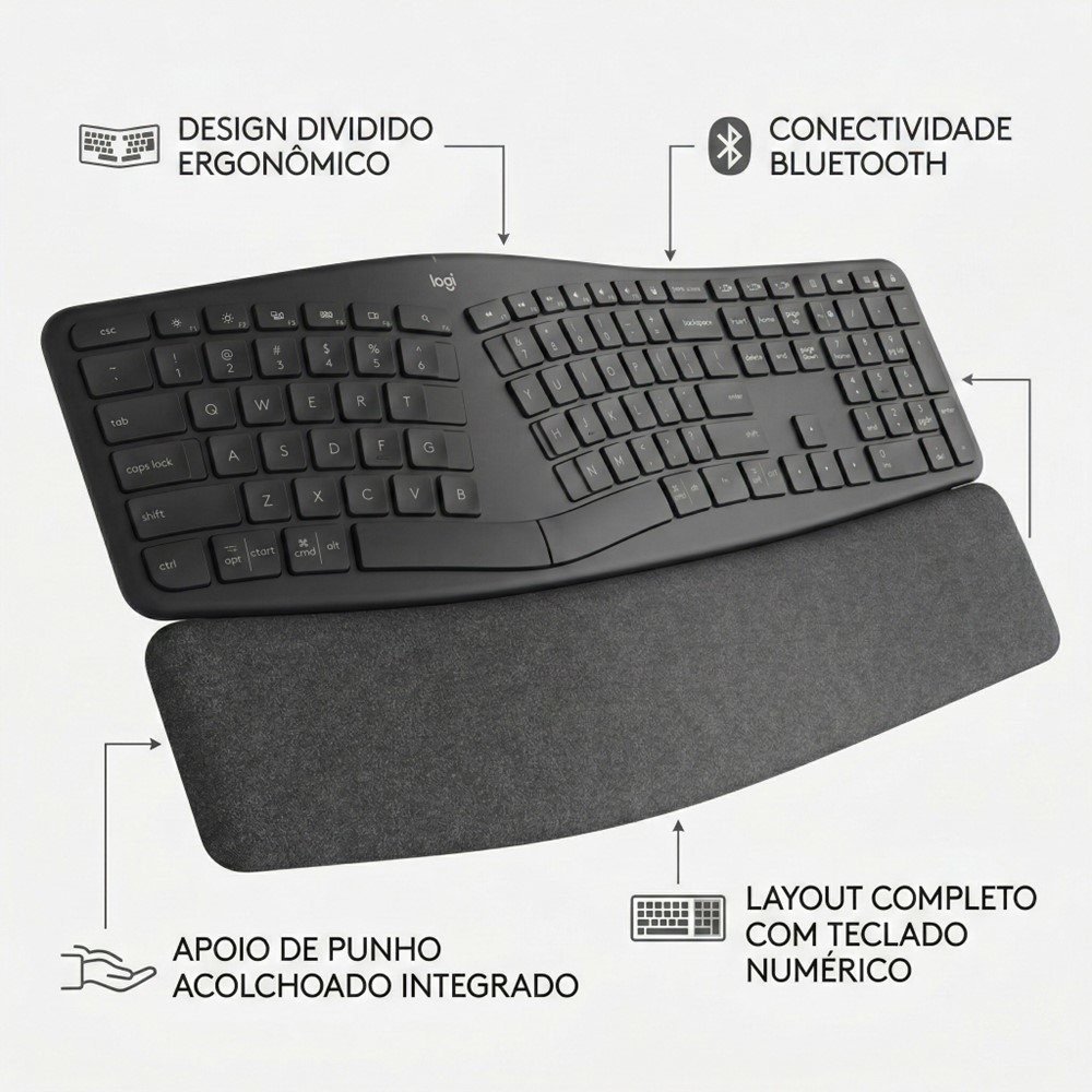 O Logitech K860 é um teclado ergonômico Bluetooth pensado para quem passa horas digitando e quer uma experiência mais confortável e natural no dia a dia. O design ergonômico ajuda a manter as mãos e os punhos em uma posição mais agradável, reduzindo aquela sensação de "peso" após longos períodos de trabalho, estudo ou home office.