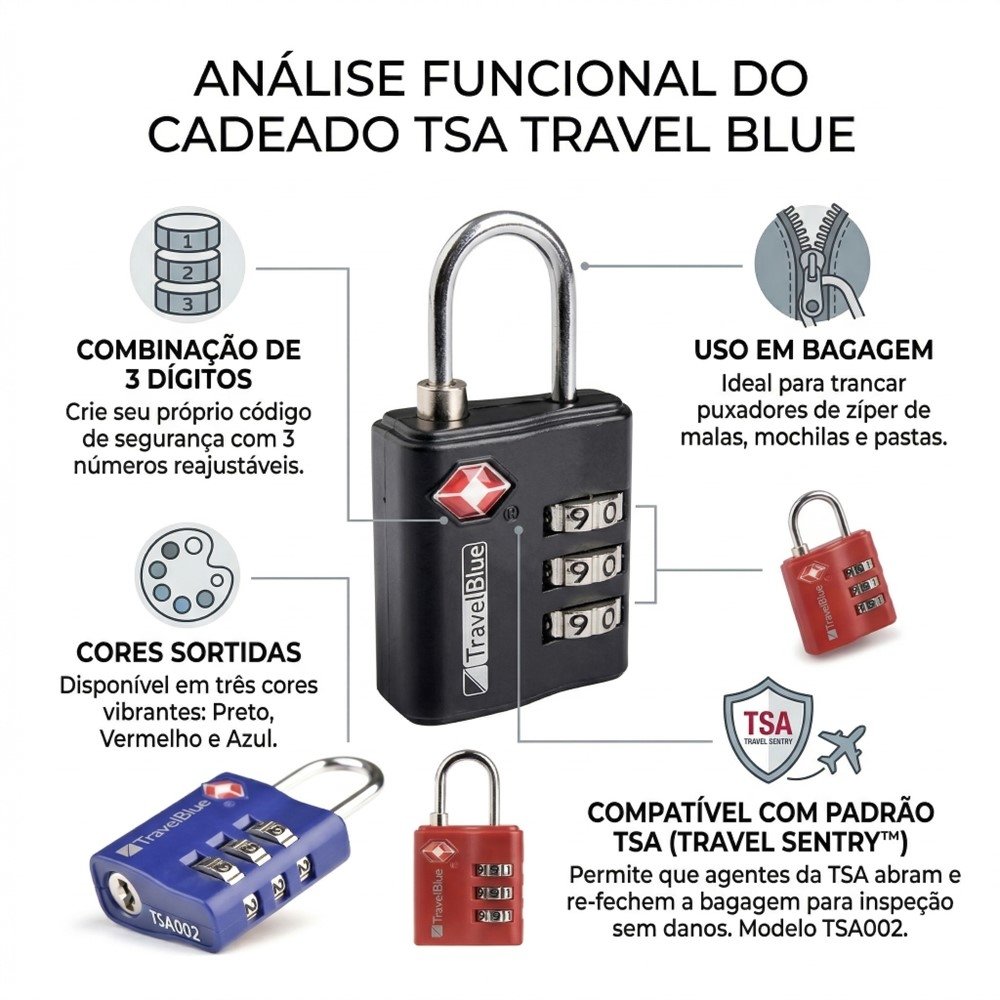 O Cadeado TSA com Combinação Travel Blue é a escolha prática para quem quer proteger a mala sem complicar a viagem. Em vez de depender de chaves (que podem se perder no caminho), você usa uma combinação numérica para fechar e abrir com rapidez sempre que precisar.