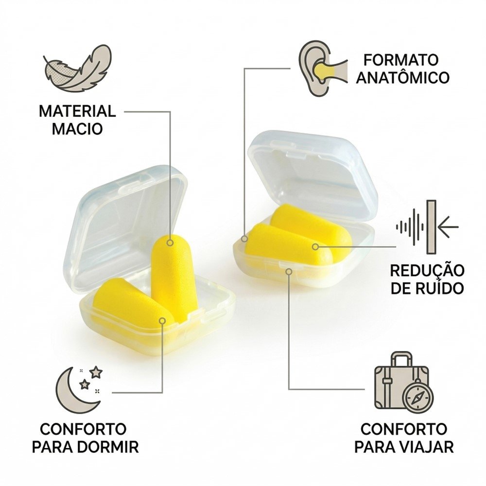 A cor amarela facilita encontrar e manusear o produto com mais praticidade, principalmente em rotinas de viagem e uso fora de casa. É uma solução simples para quem busca mais bem-estar e concentração quando precisa de um ambiente mais silencioso.