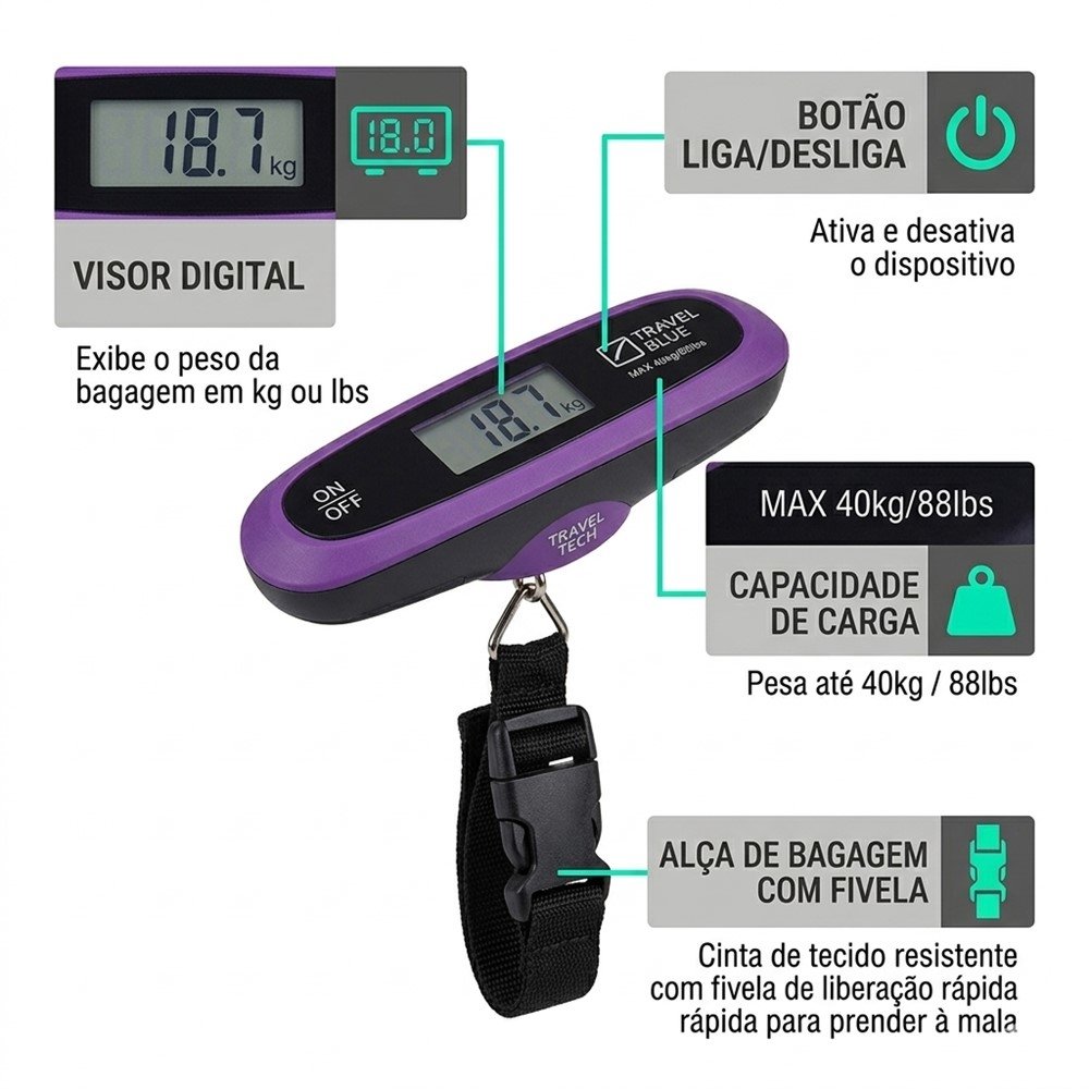 Evite a dor de cabeça de descobrir o peso da mala só no aeroporto. A Balança Digital Travel Blue para Bagagem é uma solução prática para quem quer se planejar melhor antes da viagem e reduzir o risco de taxas por excesso de peso no check-in.