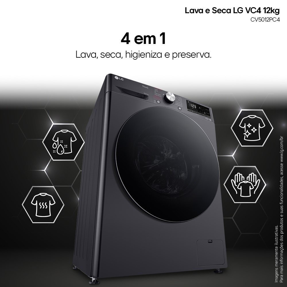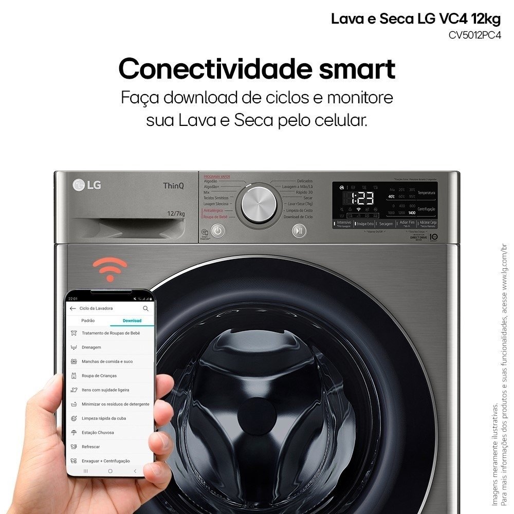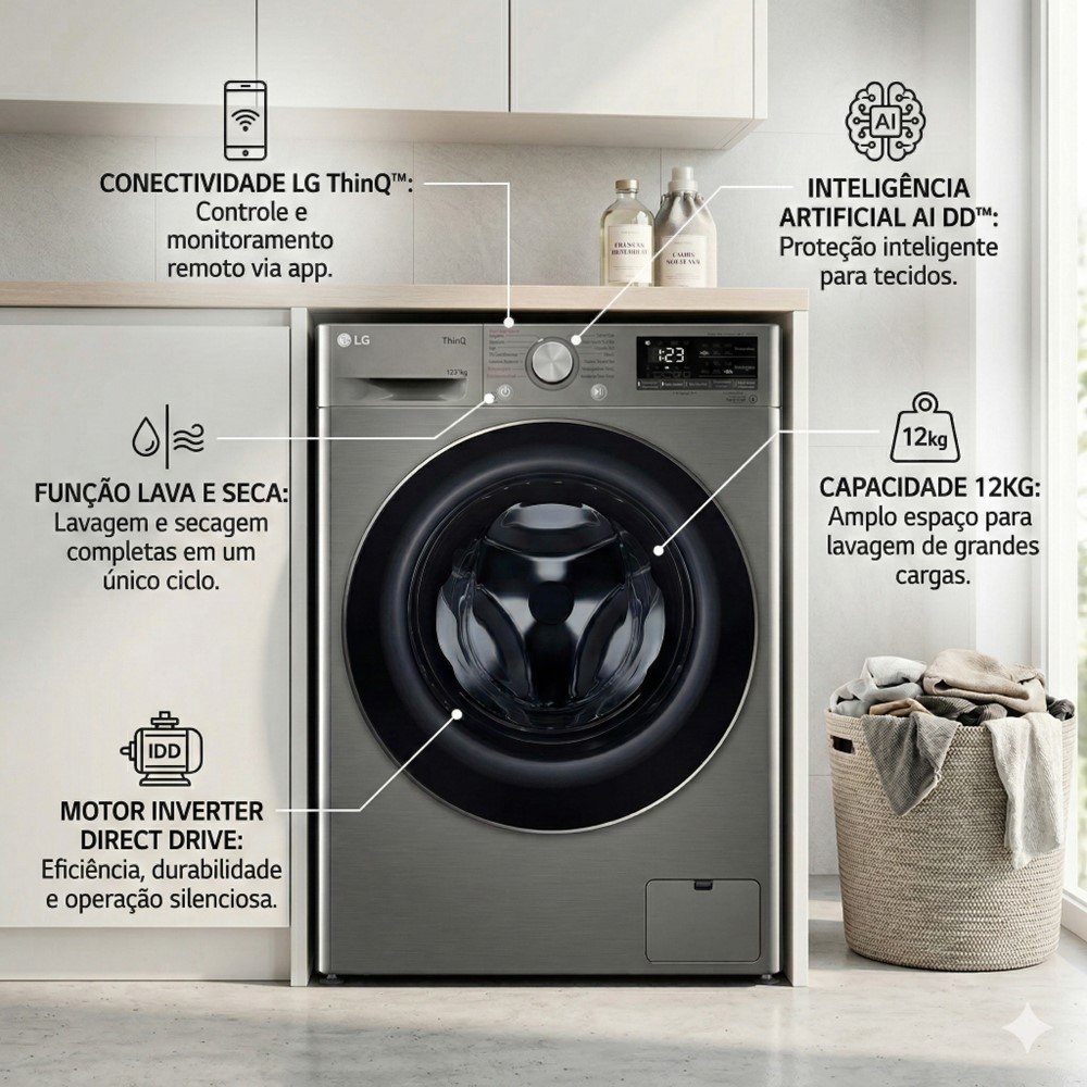 | Informações Adicionais | Lava e Seca no mesmo produto; Alta Capacidade num tamanho compacto; Inteligência Artificial AI DD; Ciclos com Vapor - Antialérgico e Roupa de Bebê; Ciclo rápido 30; Conectividade Wi-Fi com LG ThinQ; Download de ciclos; Porta de Vidro temperado; Design Compacto. |