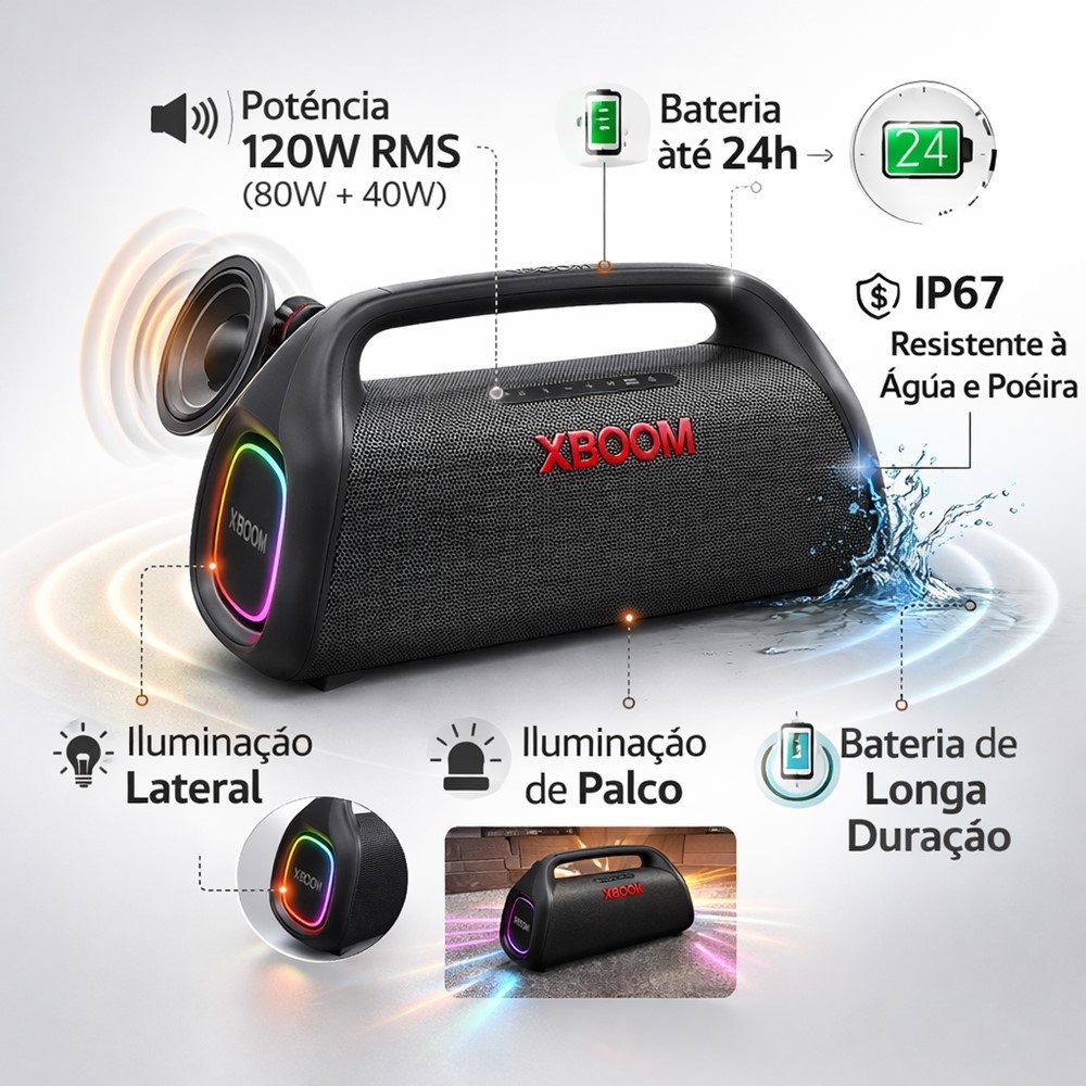 Leve sua música para onde fizer sentido - sem se preocupar com tomada o tempo todo. A LG XBOOM GO XG9S entrega um som forte e encorpado para momentos em casa, no churrasco, na área externa ou em encontros com amigos, com a praticidade do uso sem fio.