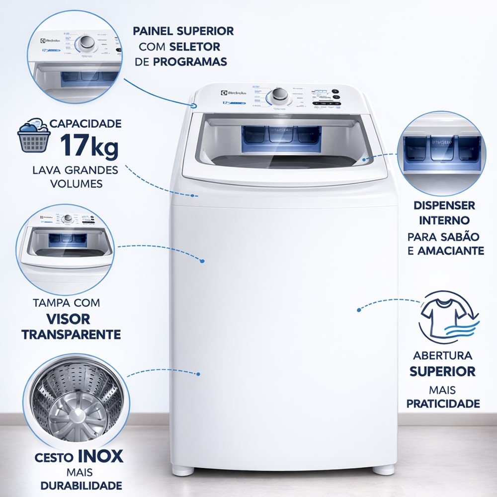A Lavadora de Roupas Electrolux LED17 17kg foi pensada para quem quer agilidade sem abrir mão de cuidado no dia a dia. Com alta capacidade, ela ajuda você a lavar mais peças de uma vez, reduzindo a quantidade de ciclos e deixando a rotina mais leve - especialmente em casas com família maior, crianças ou grande volume de roupas.