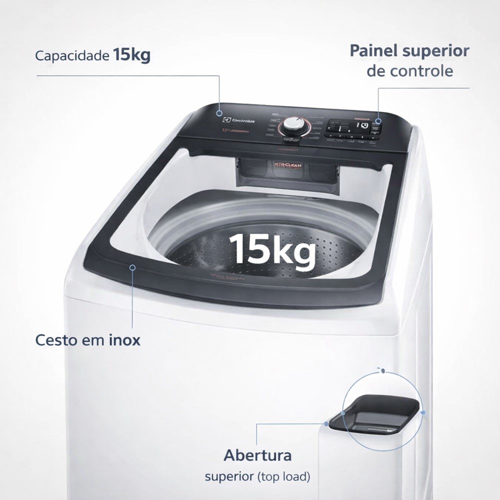 A Lavadora de Roupas Electrolux LEC15 de 15kg foi pensada para quem quer ganhar tempo sem abrir mão de cuidado com as peças. Com alta capacidade, ela ajuda a reduzir a quantidade de ciclos na semana, facilitando a organização da lavanderia e deixando a rotina mais leve - especialmente em casas com maior volume de roupas, toalhas e roupas de cama.