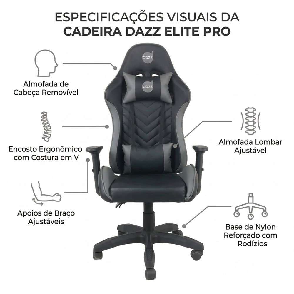 Cadeira Gamer Dazz Elite Pro Preto/Cinza - Conforto para longas sessões e visual gamer premium