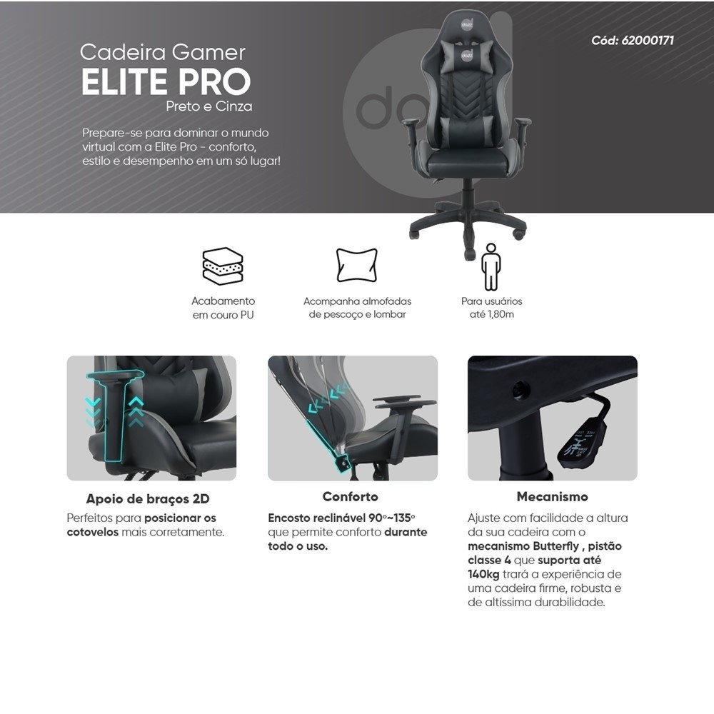 Se você procura uma cadeira gamer de marca conhecida no segmento, com acabamento em preto e cinza e presença de produto "de verdade" na estação de jogos, a Elite Pro é uma escolha direta: feita para o seu espaço e para a sua rotina.