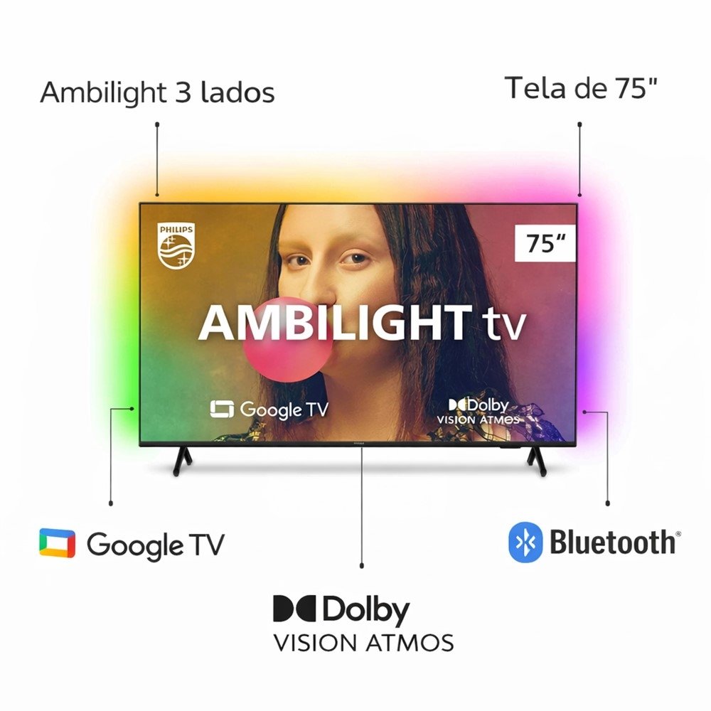 | Funções | Ambilight 3 lados; Imagem HDR; Dolby Vision Atmos; Google Assistant Built-in. |