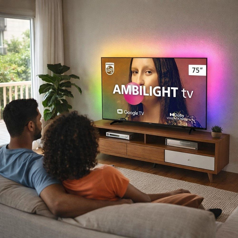 O grande diferencial está no Ambilight em 3 lados: luzes na parte traseira da TV acompanham o conteúdo da tela, criando uma sensação de tela ampliada e mais envolvimento na hora de assistir. É o tipo de recurso que muda o clima da sala e deixa a experiência mais "de cinema", sem complicação.