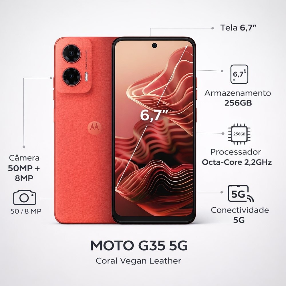 O Motorola Moto G35 5G foi pensado para quem quer um smartphone rápido no dia a dia, com muito espaço interno e uma tela grande para curtir conteúdos, trabalhar e conversar com conforto. Com 256GB de armazenamento, você ganha liberdade para guardar fotos, vídeos, apps e arquivos sem ficar apagando tudo a todo momento.
