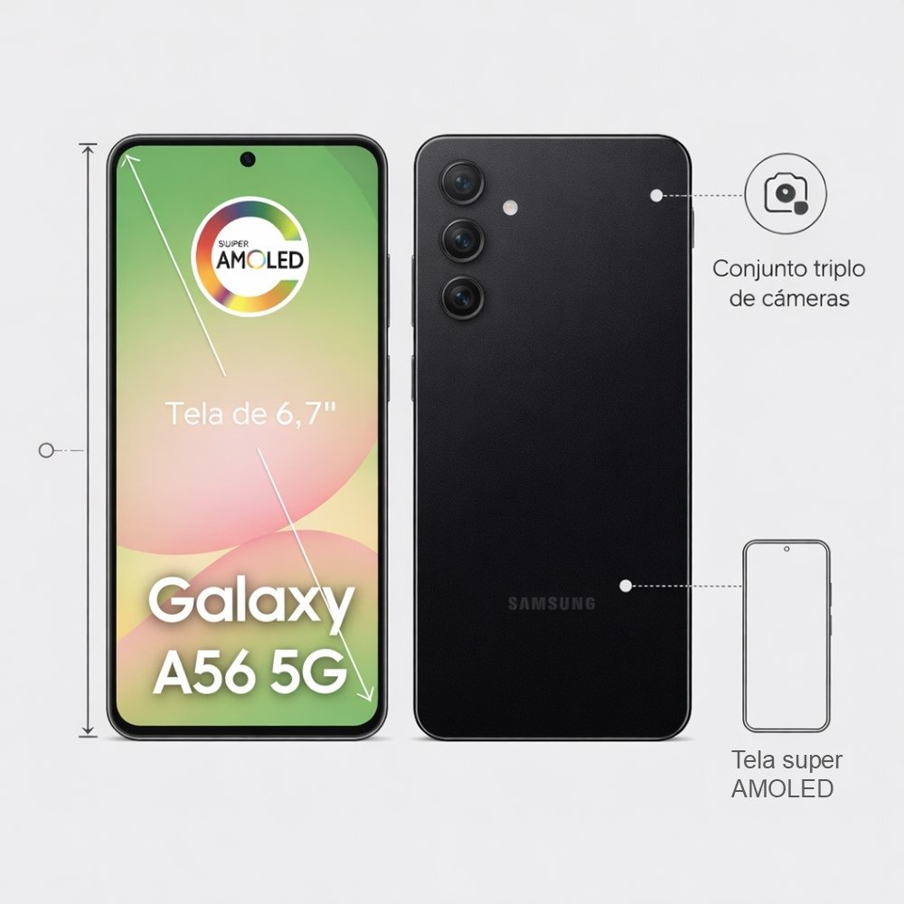 O Samsung Galaxy A56 5G foi feito para quem quer um smartphone rápido, com muita tela e espaço de sobra para usar todos os dias. A tela de 6.7" entrega uma experiência mais imersiva para vídeos, redes sociais e leitura - ótima para quem passa bastante tempo no celular e quer enxergar tudo com mais conforto.