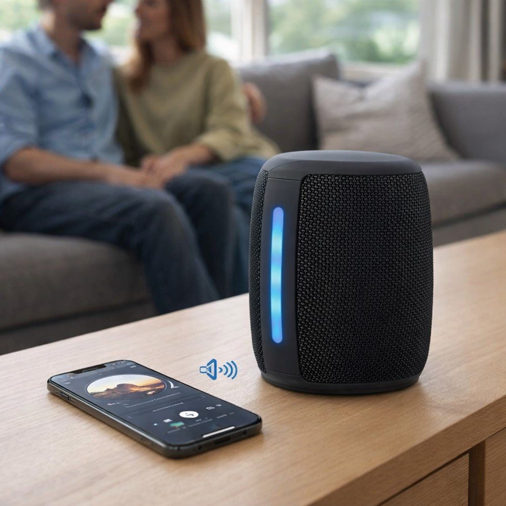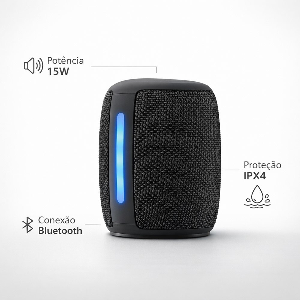 A conexão Bluetooth facilita sua rotina: você coloca para tocar direto do celular e mantém o ambiente mais organizado, sem depender de cabos. Já a proteção IPX4 ajuda a trazer mais tranquilidade no uso em situações comuns, como respingos e umidade leve - ideal para áreas como cozinha, varanda ou momentos de lazer, com mais segurança no uso.