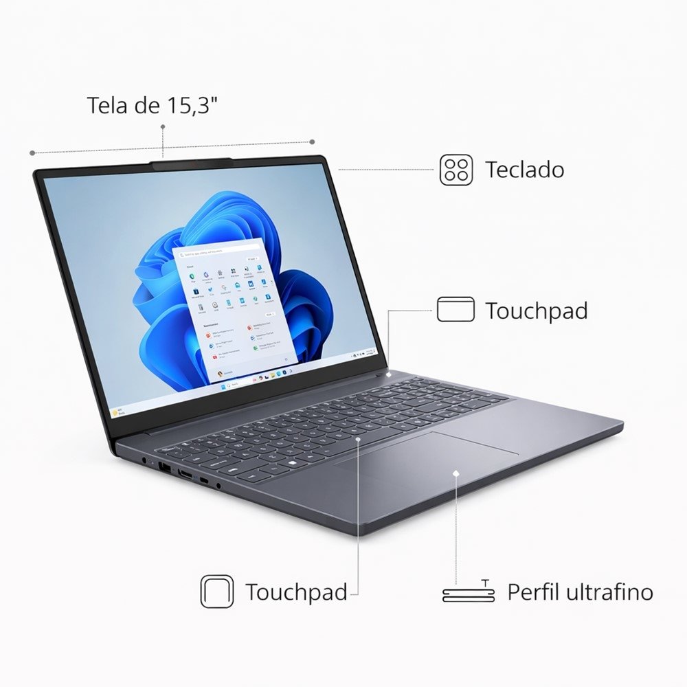 O conjunto com SSD de 512GB ajuda o sistema a iniciar mais rápido e deixa tudo mais responsivo ao abrir programas e arquivos. Já a tela de 15.3" oferece mais área útil para planilhas, aulas e navegação, trazendo mais conforto para quem passa horas em frente ao notebook.
