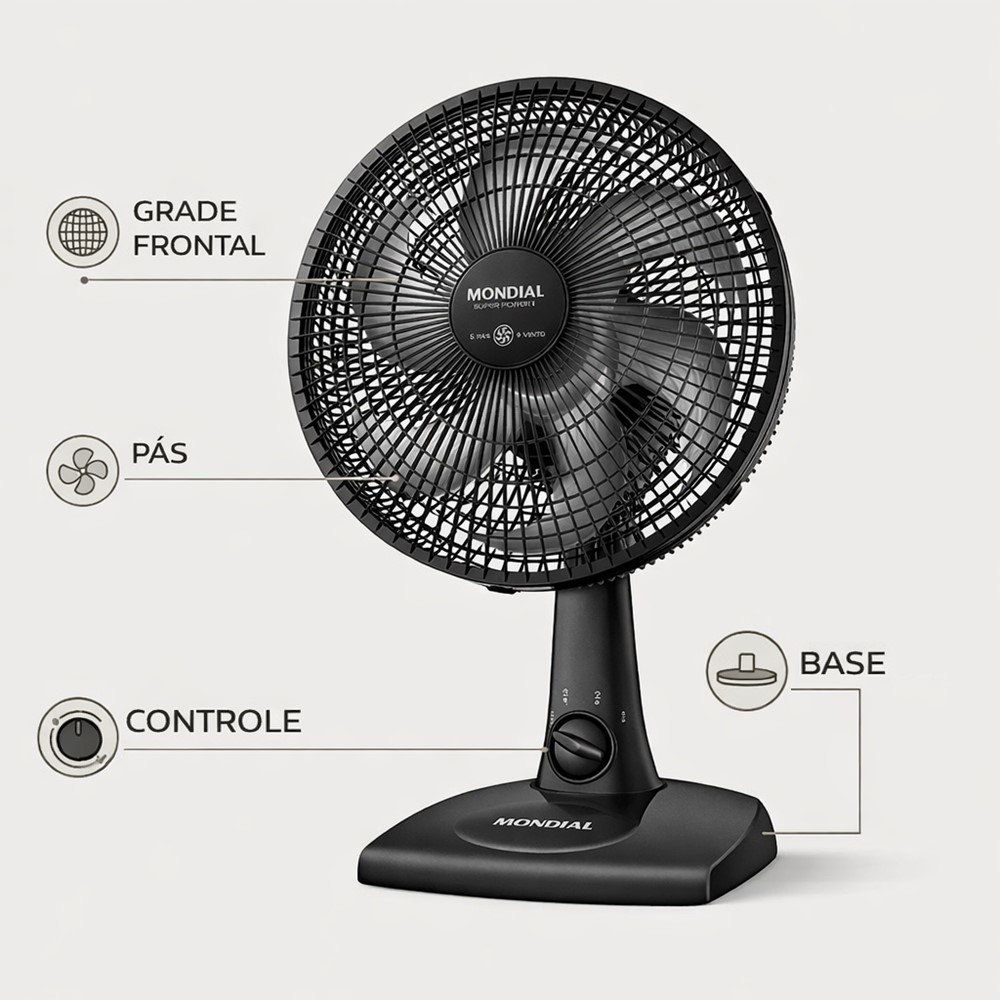 O Ventilador de Mesa Mondial Super Power II foi feito para quem quer ventilação eficiente no dia a dia, com um tamanho prático para usar em diferentes ambientes da casa ou do trabalho. Com 30cm, ele entrega uma brisa bem distribuída para ajudar a deixar o espaço mais agradável em momentos de calor.