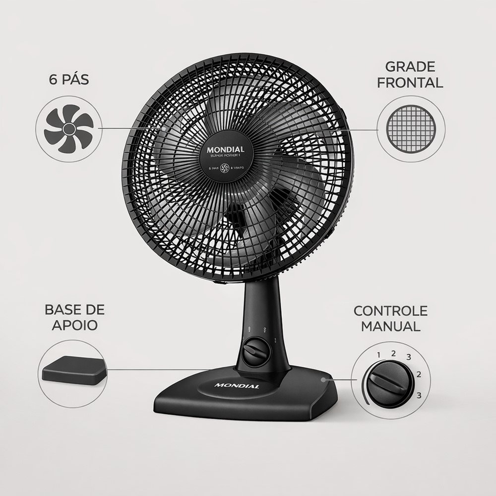 O Ventilador de Mesa Mondial Super Power II foi feito para quem quer sensação de refrescância rápida em ambientes como quarto, sala ou escritório, sem complicação. Com 30cm e 6 pás, ele entrega um fluxo de ar eficiente para o dia a dia - ideal para aliviar o calor enquanto você trabalha, estuda ou descansa.