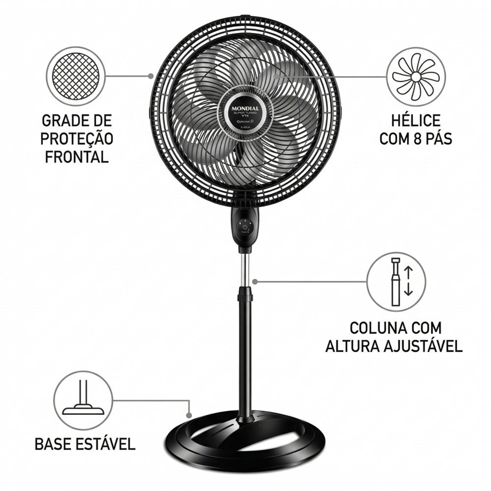 Encare os dias mais quentes com mais conforto usando o Ventilador de Coluna Mondial Super Turbo. Com 40cm e 8 pás, ele entrega uma ventilação intensa para ajudar a refrescar o ambiente quando você está trabalhando, descansando ou cuidando da casa.