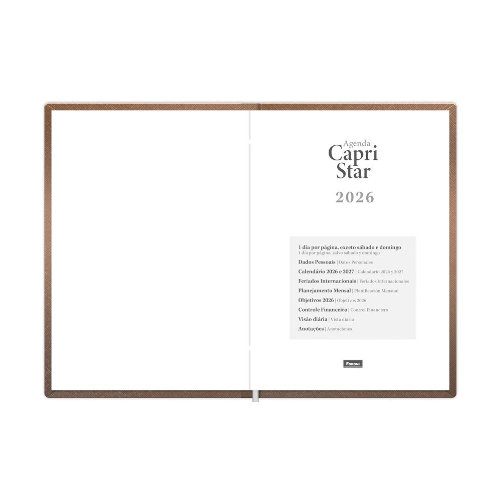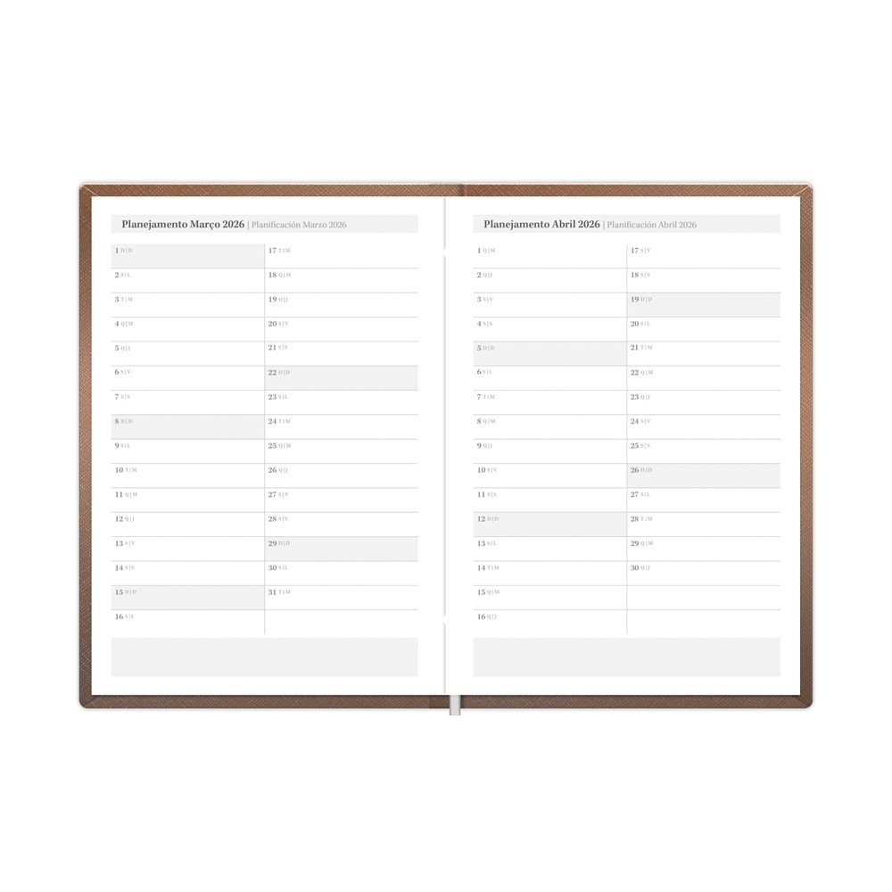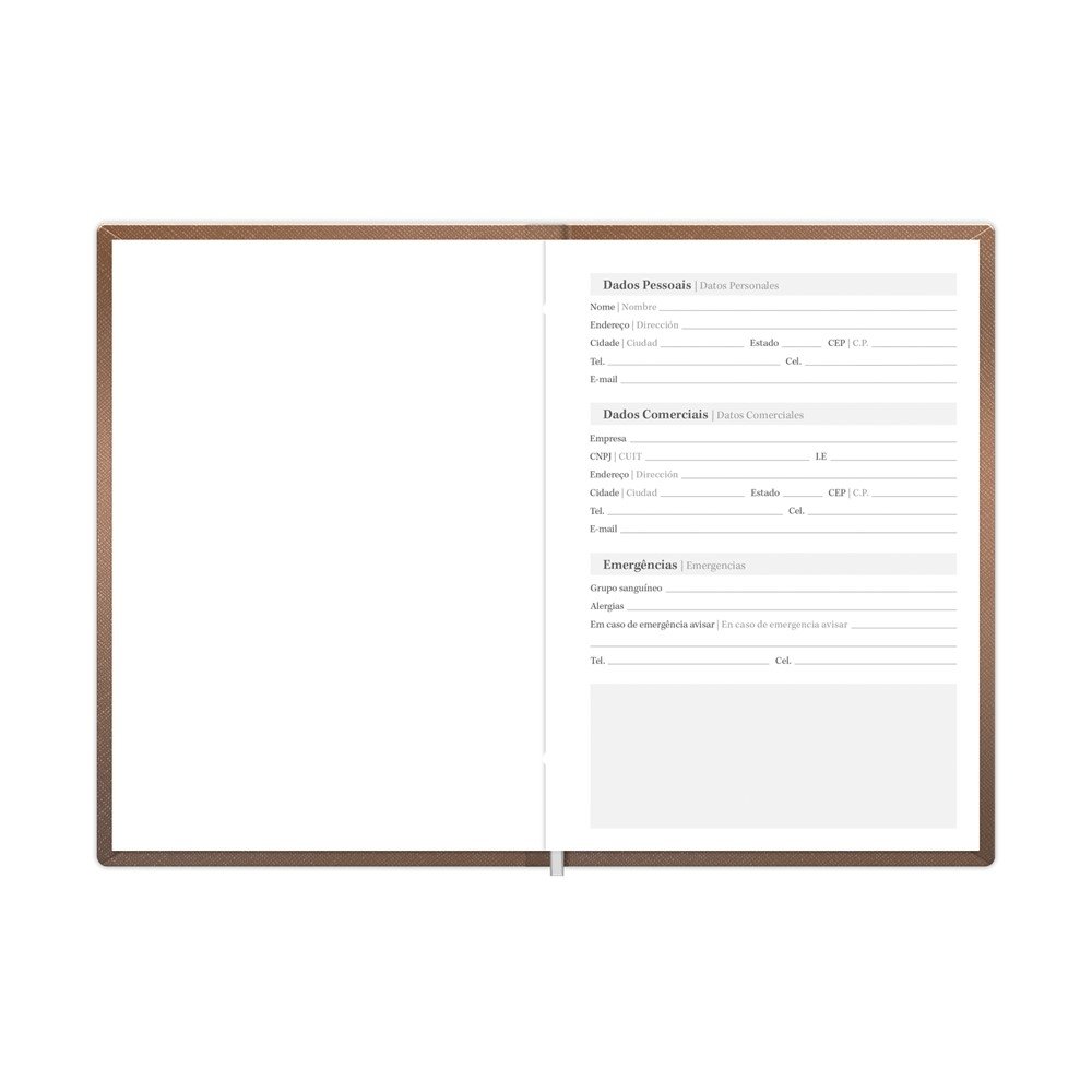 | Dados Adicionais | - Fitilho marcador de página - Gramatura: 56 g/m² - Miolo em 2 idiomas: Português e Espanhol - Visão de 1 dia por página, exceto sábado e domingo |