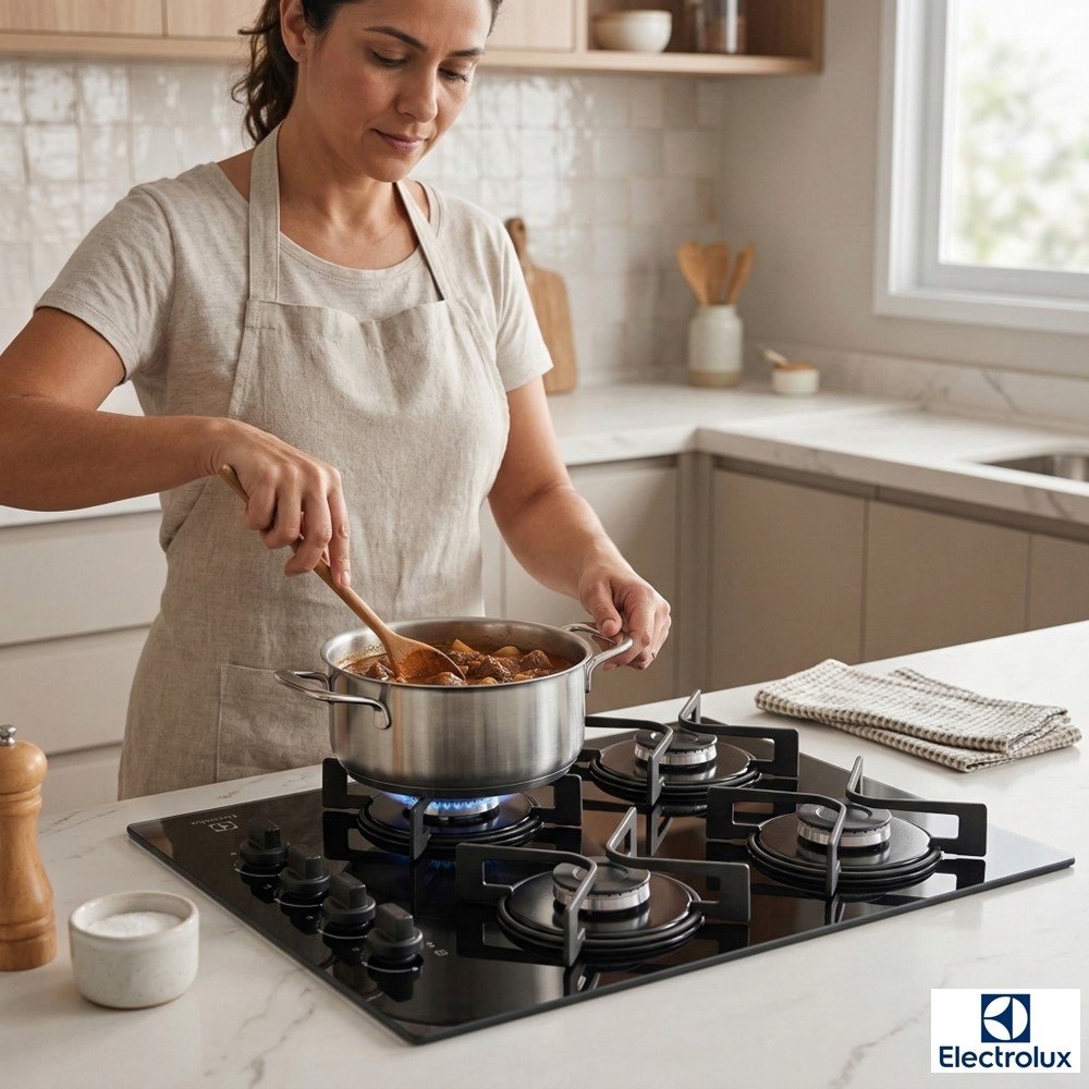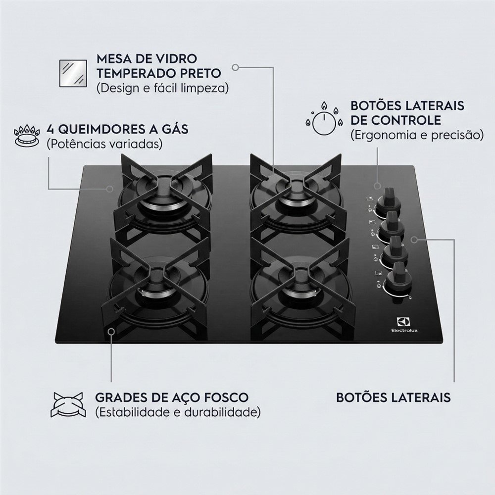 O Cooktop a Gás Electrolux KE4GR 4 bocas foi feito para quem quer unir visual moderno e praticidade na cozinha. A mesa de vidro na cor preta valoriza o ambiente e ajuda a deixar o espaço com aparência mais organizada, ideal para cozinhas planejadas e bancadas compactas.