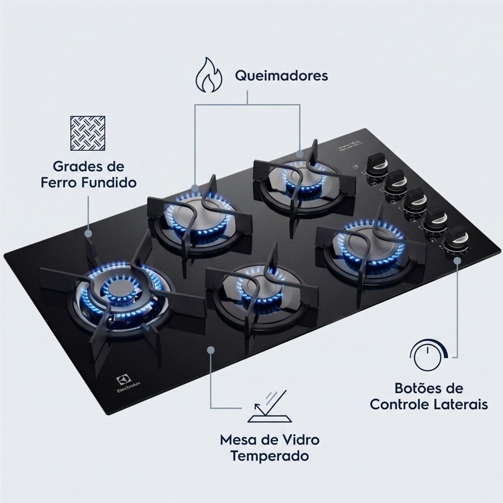 Com 5 bocas, você organiza melhor as receitas em paralelo - ideal para quem prepara almoço completo, recebe em casa ou simplesmente quer mais agilidade para cozinhar sem "fila" no fogão.