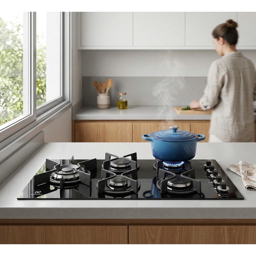 O Cooktop a Gás Electrolux KE5GW 5 bocas foi pensado para quem cozinha de verdade e quer uma bancada mais bonita, prática e segura no dia a dia. A mesa de vidro na cor preta deixa o ambiente mais moderno e facilita a limpeza: respingos e marcas do uso saem com mais agilidade, sem complicar sua rotina.