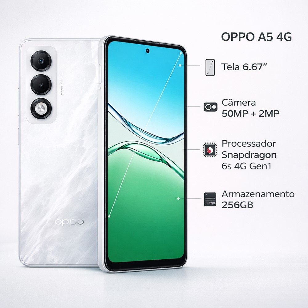 O OPPO A5 4G foi feito para quem quer um smartphone completo para o dia a dia, com tela grande de 6,67" para assistir, ler e navegar com mais conforto, e 256GB de armazenamento para guardar seus apps, fotos e vídeos sem ficar apagando arquivos o tempo todo.