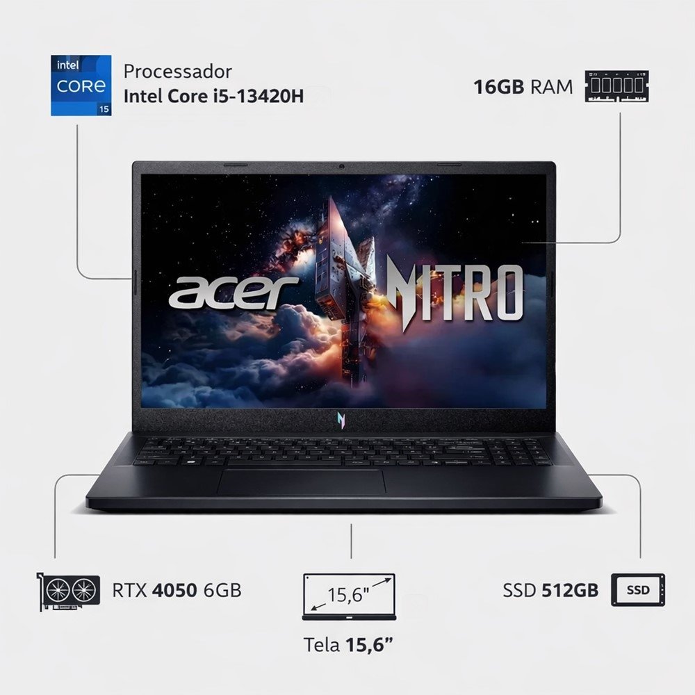 O Acer Nitro V15 foi feito para quem quer um notebook gamer de verdade, com desempenho consistente para jogos atuais, estudos e criação de conteúdo. A combinação do Intel Core i5-13420H com 16GB de RAM entrega agilidade no dia a dia e mais fôlego para multitarefas - ideal para alternar entre jogo, Discord, navegador, aulas e ferramentas de trabalho sem travar a sua rotina.