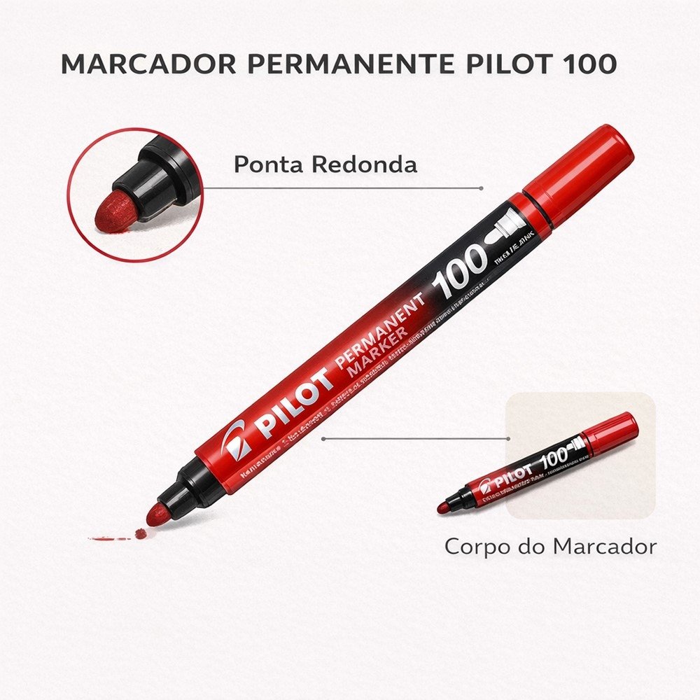 O Marcador Permanente Pilot Marker 100 é a escolha certa para quem precisa de uma marcação visível, prática e consistente no dia a dia. Com ponta redonda e cor vermelha, ele ajuda a destacar informações rapidamente - seja para organização, identificação ou sinalização.