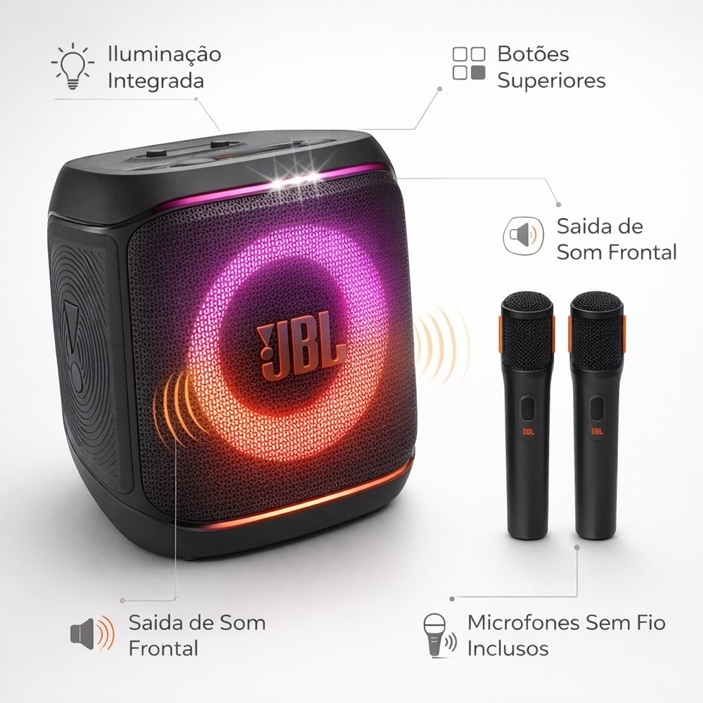 A JBL PartyBox Encore é a escolha ideal para quem quer transformar qualquer encontro em um momento memorável. Com 100W de potência sonora, ela entrega graves encorpados e som claro, preenchendo o ambiente com a qualidade já reconhecida da JBL.