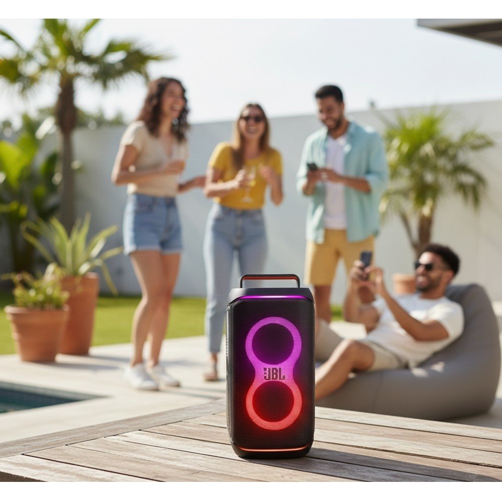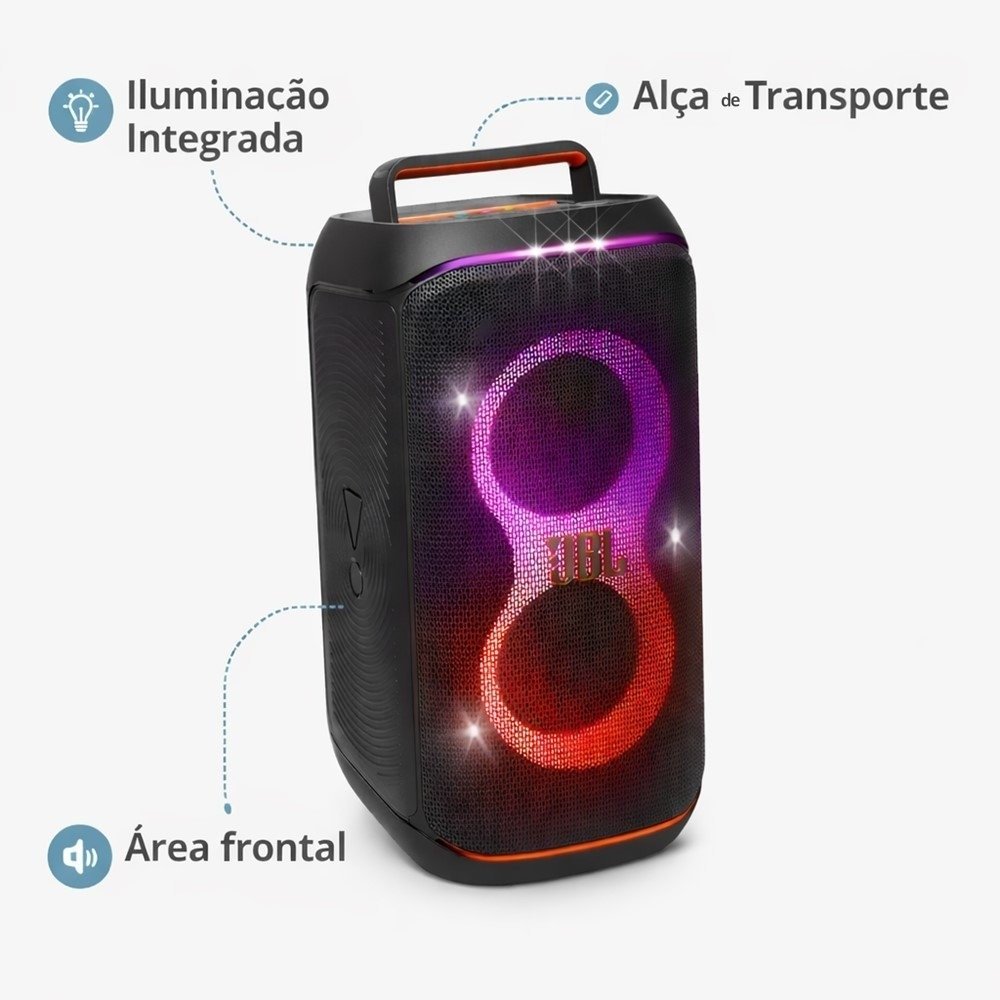 O design robusto com alça integrada facilita o transporte, enquanto a assinatura sonora JBL oferece graves presentes e som equilibrado, mesmo em volumes mais altos. É a escolha ideal para quem busca potência, estilo e facilidade de uso em um único produto.