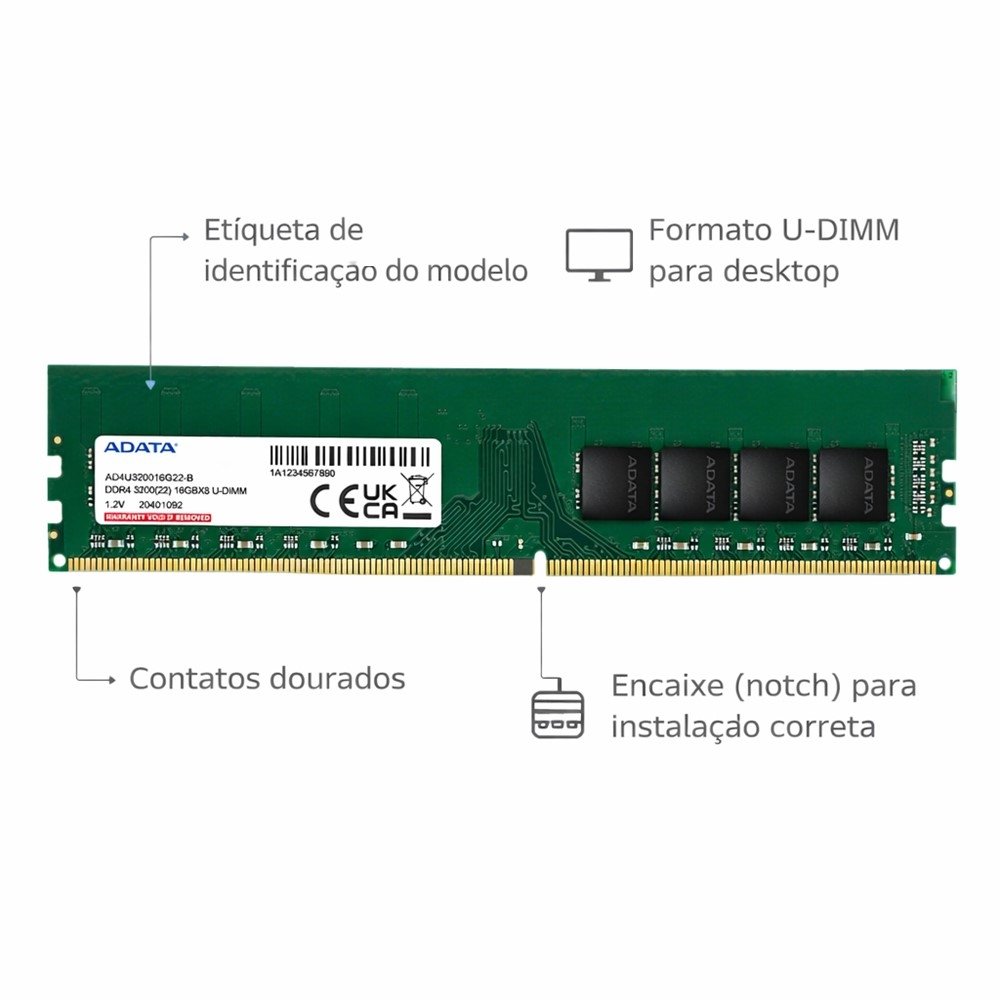 A memória RAM ADATA DDR4 16GB 3200MHz U-DIMM foi desenvolvida para quem busca mais rapidez, estabilidade e fluidez no uso diário do computador. Com maior capacidade e frequência, você percebe menos travamentos, carregamentos mais rápidos e uma experiência mais responsiva ao abrir programas, alternar entre tarefas e trabalhar com múltiplas abas.
