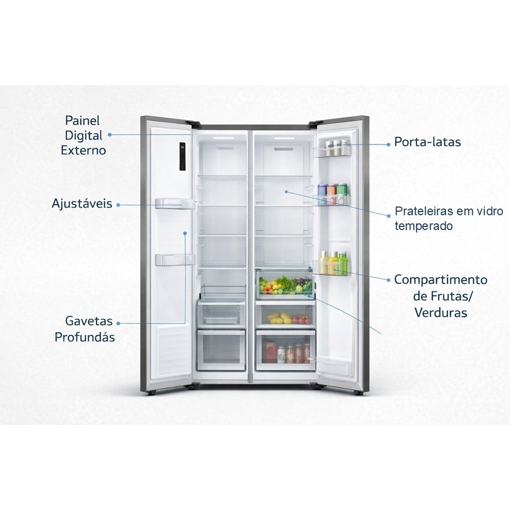 O Refrigerador LG Side by Side 509 litros é a escolha certa para quem quer mais espaço, melhor organização e uma cozinha com visual moderno. O formato Side by Side facilita a rotina: você enxerga tudo com mais rapidez, reduz o "abre e fecha" desnecessário e mantém os alimentos mais acessíveis no dia a dia.