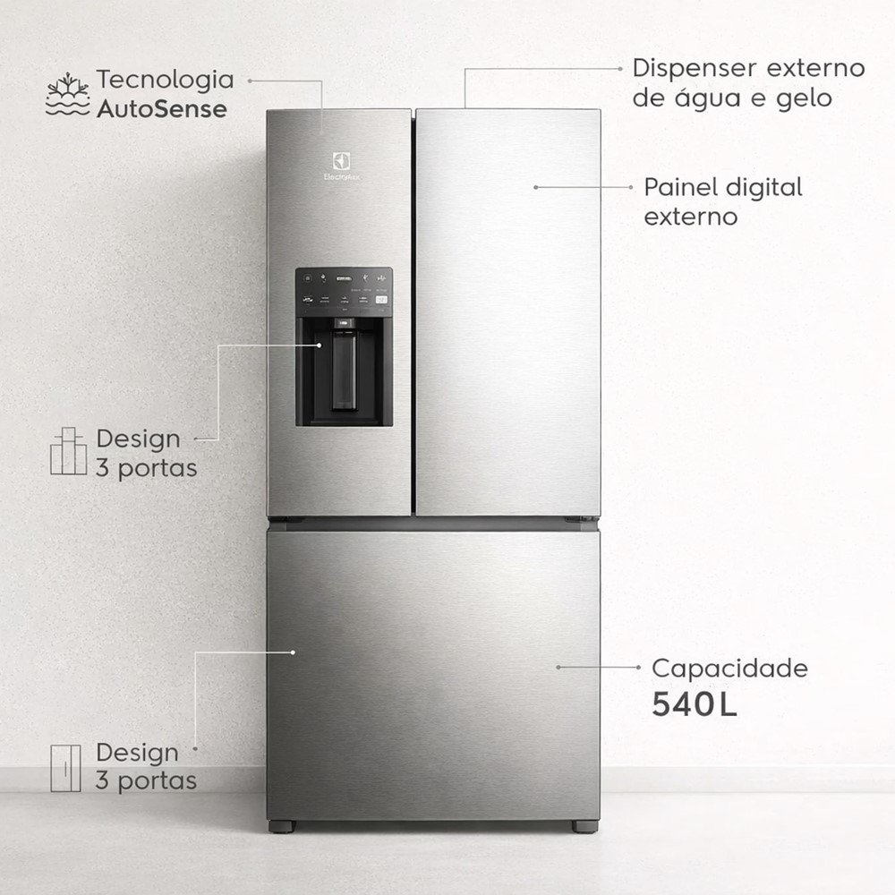 O Refrigerador Electrolux Multidoor IM8IS de 540 litros foi pensado para quem quer capacidade de verdade sem abrir mão de praticidade no dia a dia. Com 3 portas no estilo multidoor, você organiza melhor os alimentos e acessa o que precisa com mais facilidade - ótimo para rotinas corridas, famílias e quem cozinha com frequência.