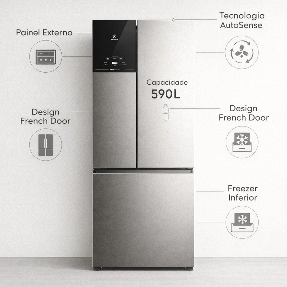 O Refrigerador Electrolux French Door IM8S 590L foi feito para quem quer muito espaço sem abrir mão de organização no dia a dia. Com design French Door (3 portas) e acabamento Inox Look, ele ajuda a deixar os itens mais usados sempre à mão e valoriza o visual da cozinha com um estilo moderno e fácil de combinar.