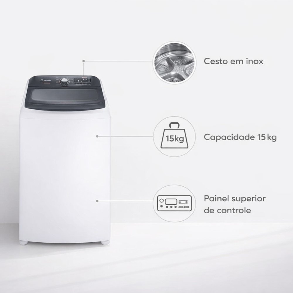 Lavadora Electrolux LEC15 15kg com Cesto Inox - Mais Capacidade e Cuidado Premium com as Roupas